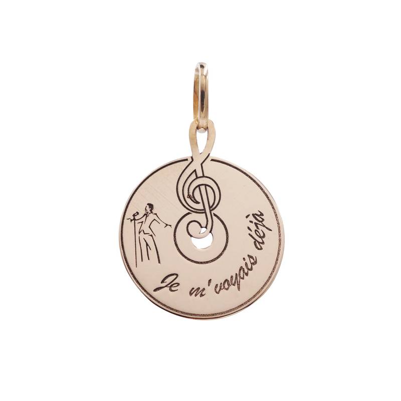 Cette médaille est en forme de CD, en or jaune 18 carats.